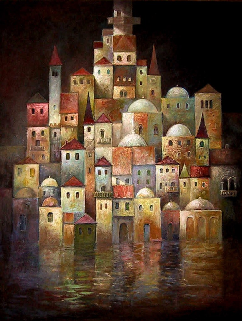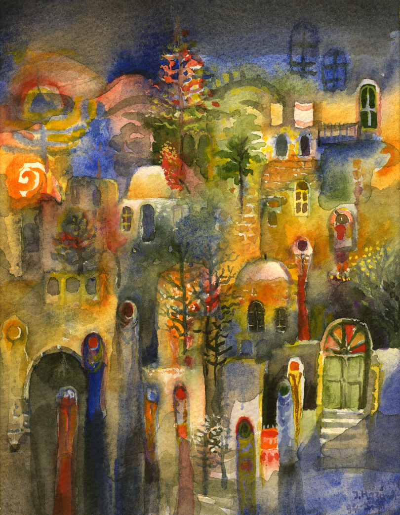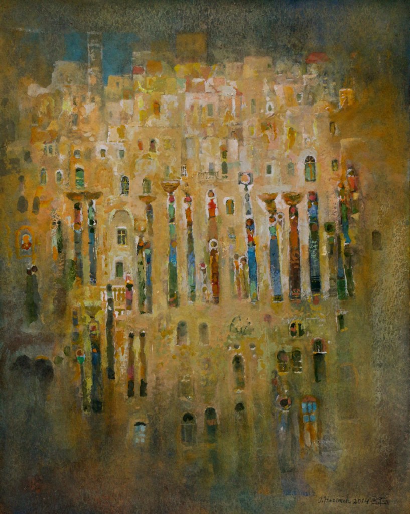 ” My memories, both beautiful and painful, are the source for my creative inspiration. The recurring artistic elements and motifs of women, homes and trees represent the longing for a Palestinian homeland. Through my art I want to give my people the dream and hope for a brighter future.”